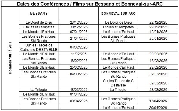 Le taleau ci-dessous vous donne les titres des films et conférences sur Bessans et Bonneval-sur-Arc